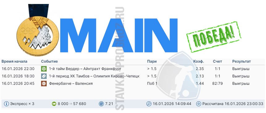 В золотом прогнозе заряжаем КФ Х7+ в каждый экспресс. Играем три события в каждом экспрессе: хоккей + баскетбол + футбол. А значит, что будем брать очередную победу!