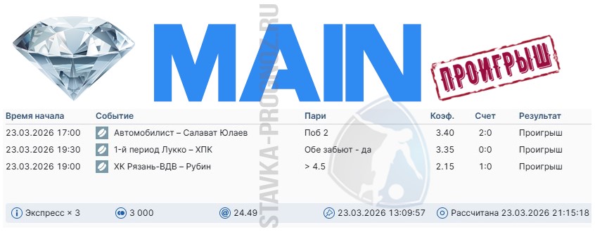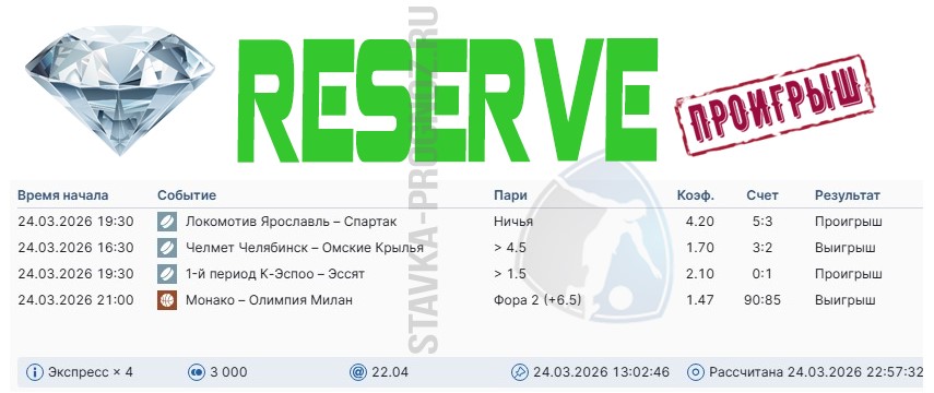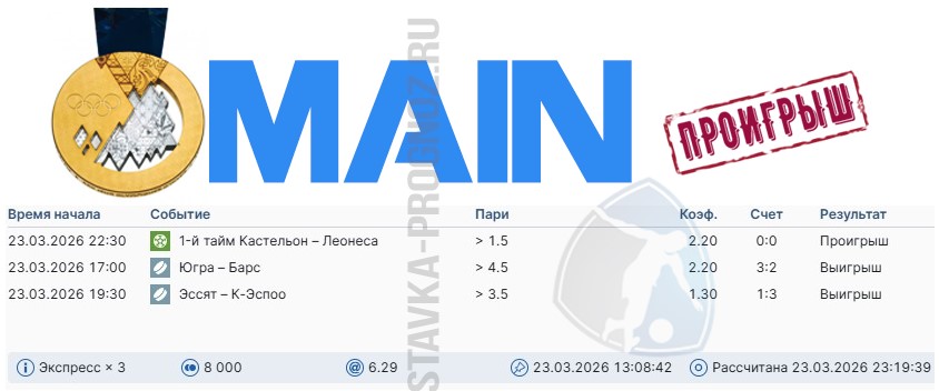 Проигрыш. 5 из 8. Допустили три промаха. Следующие прогнозы СОТКА и СОТКА2Х играем 28 и 29 марта соответственно.