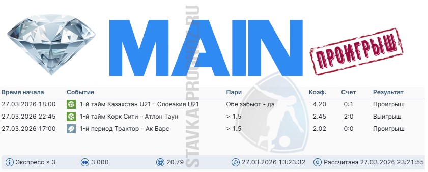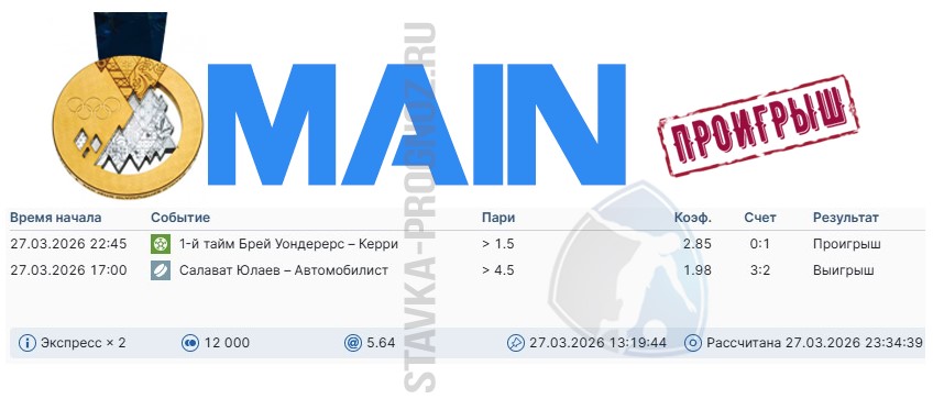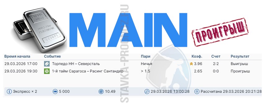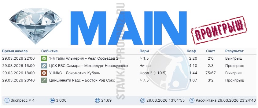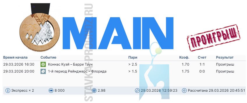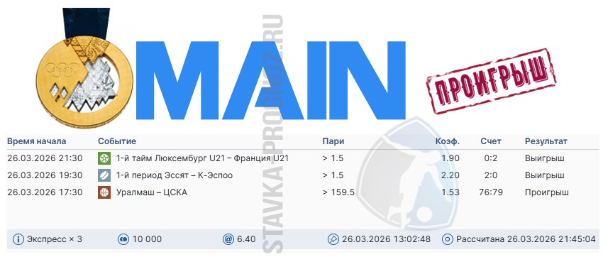 Проигрыш. Следующие прогнозы СОТКА играем 4 и 5 апреля.