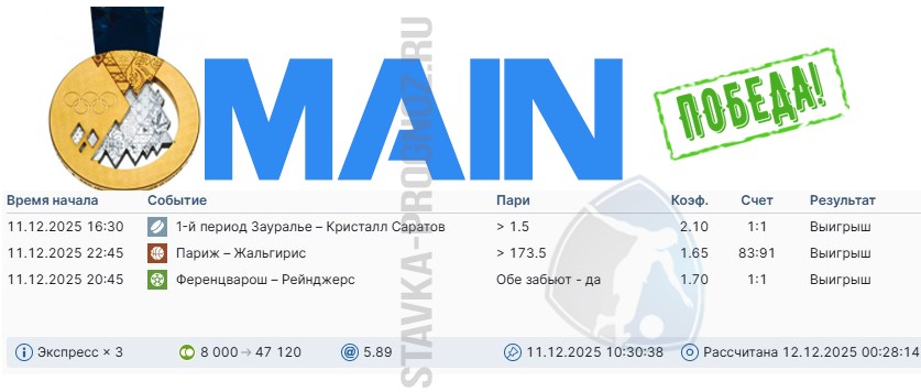 Сегодня играем все прогнозы: бронзу серебро и золото.