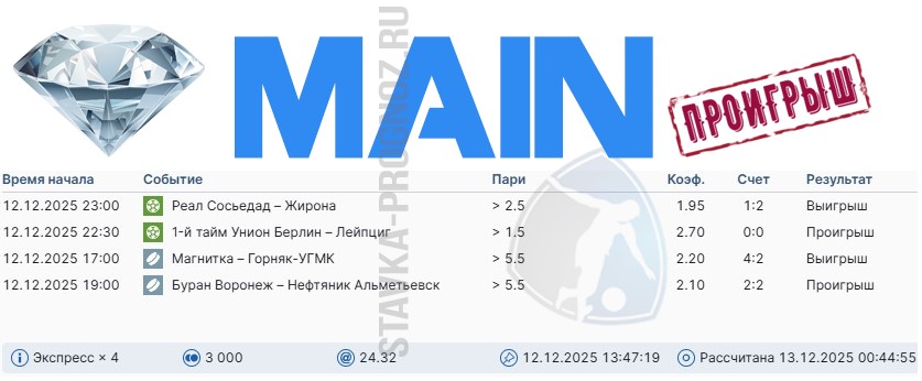 В понедельник заряжаем все основные прогнозы. Играем на рабочих ставках.