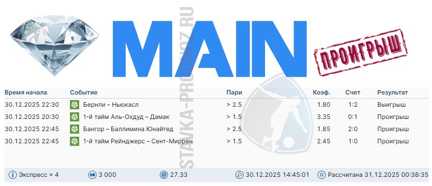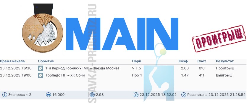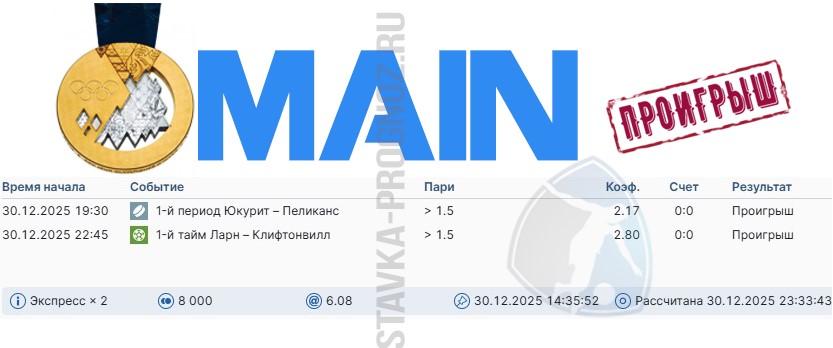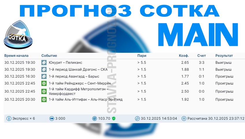 Во вторник линия хорошая. Поэтому играем все основные прогнозы + субботний прогноз СОТКА, который мы не играли 27 декабря.