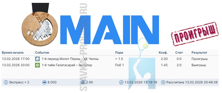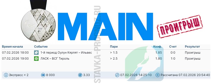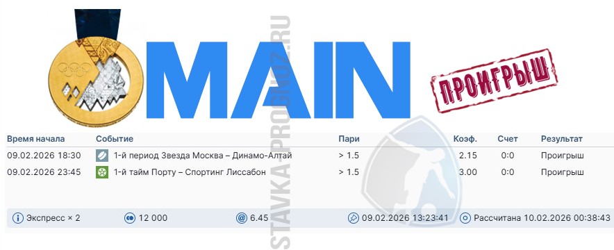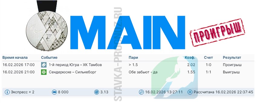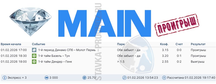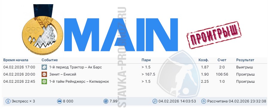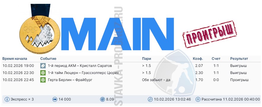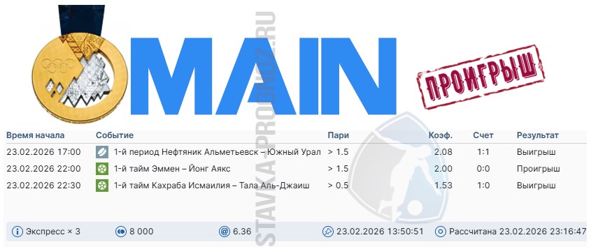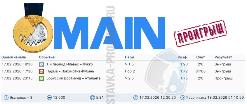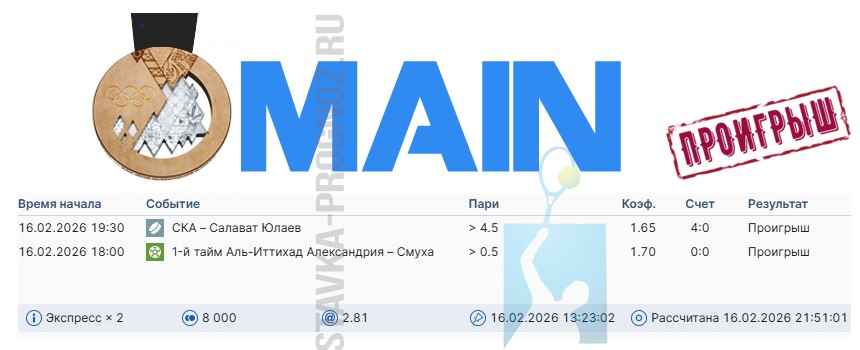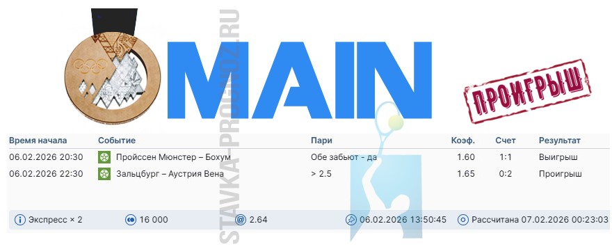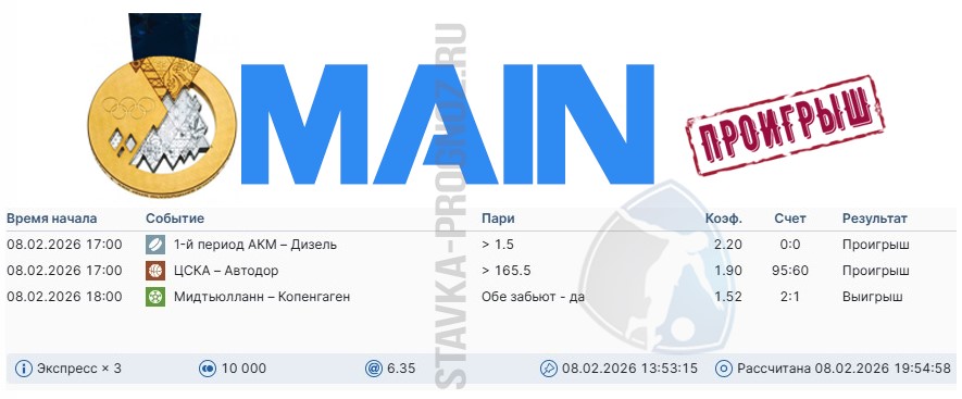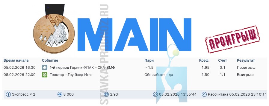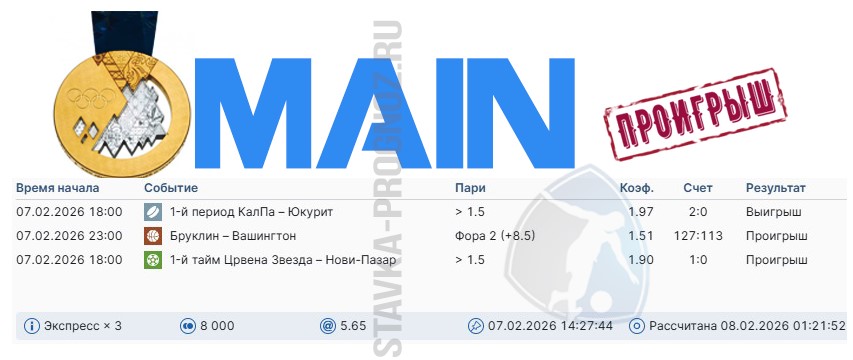 Проигрыш. 3 из 8. Следующие прогнозы играем 14 и 15 февраля соответственно.