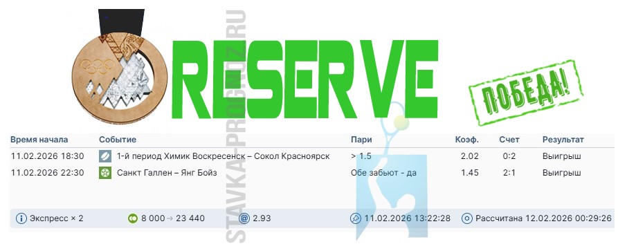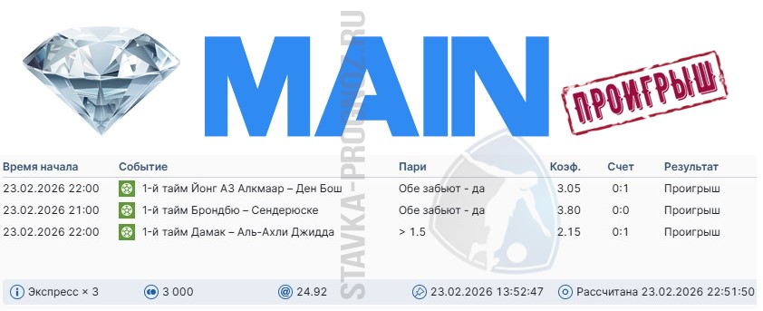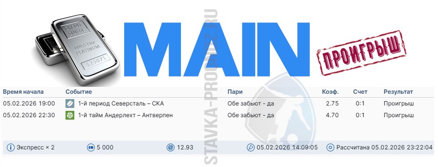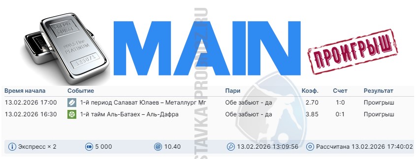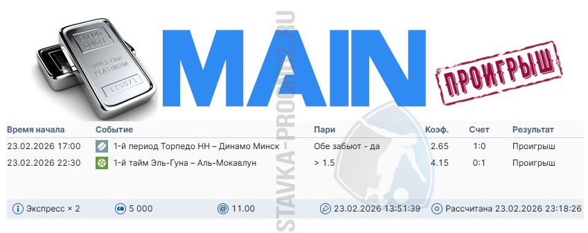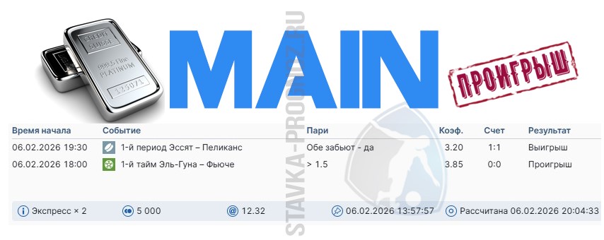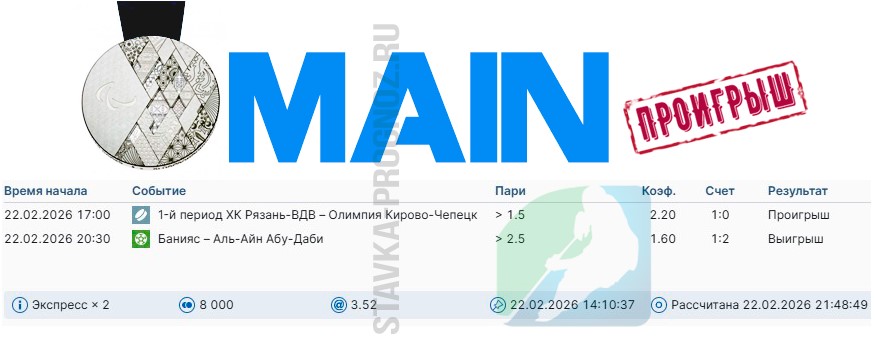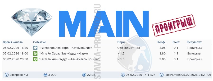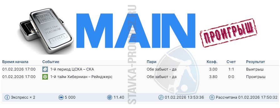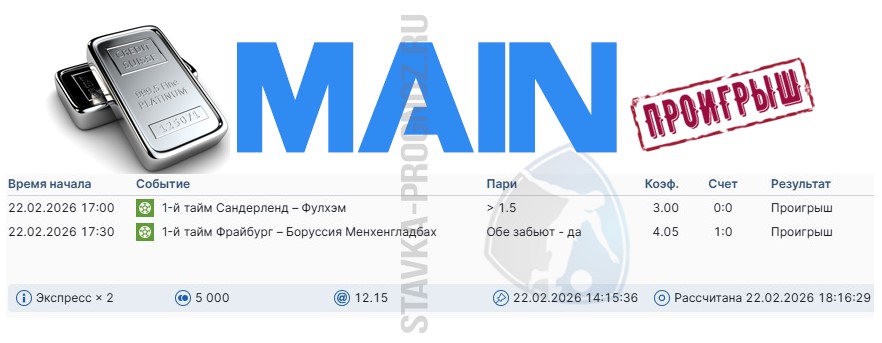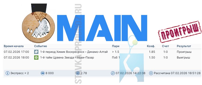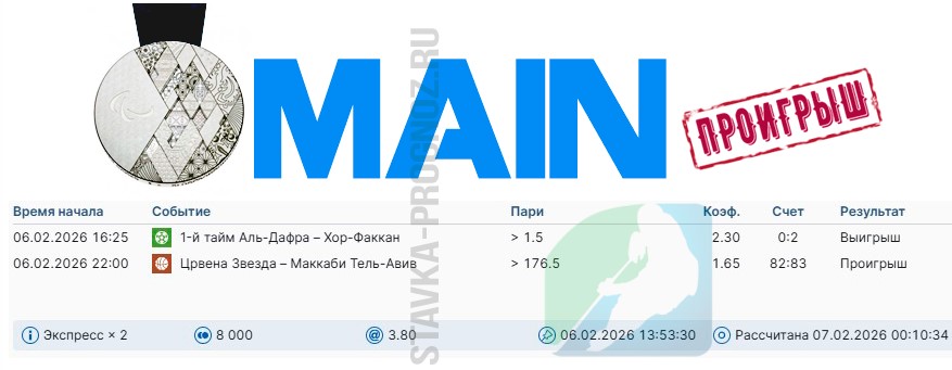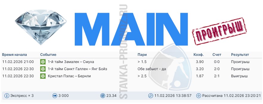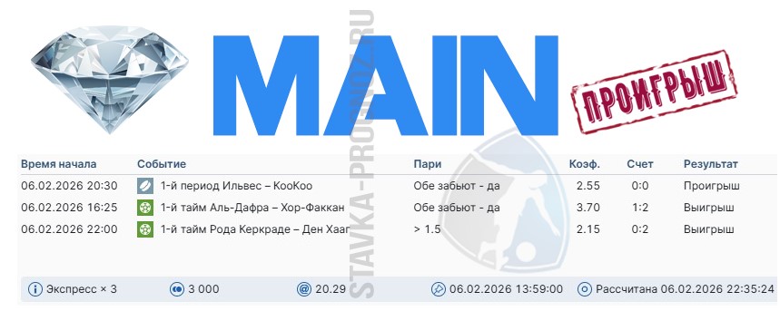 Проигрыш. 3 из 8. Следующие прогнозы играем 14 и 15 февраля соответственно.
