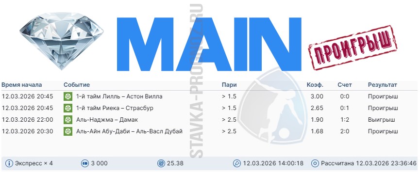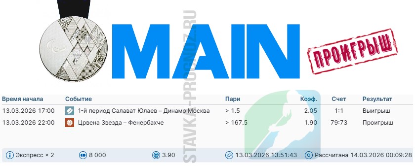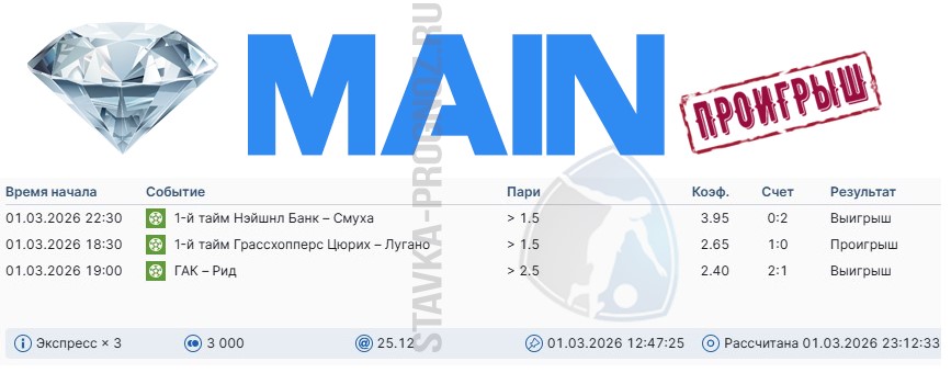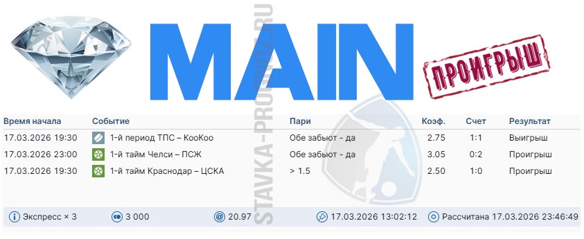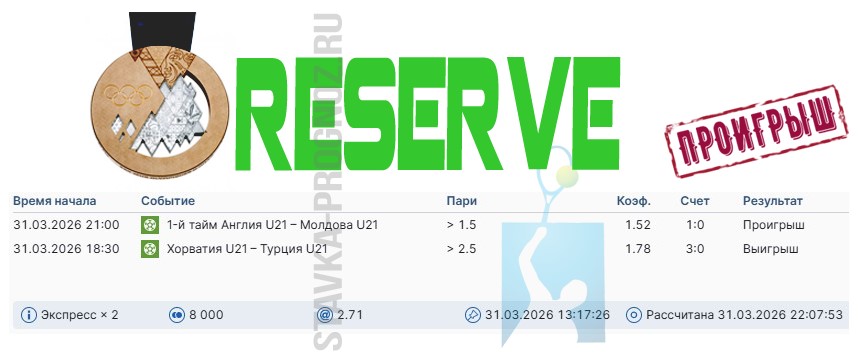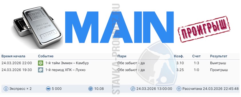 Проигрыш. Следующие прогнозы СОТКА играем 4 и 5 апреля.